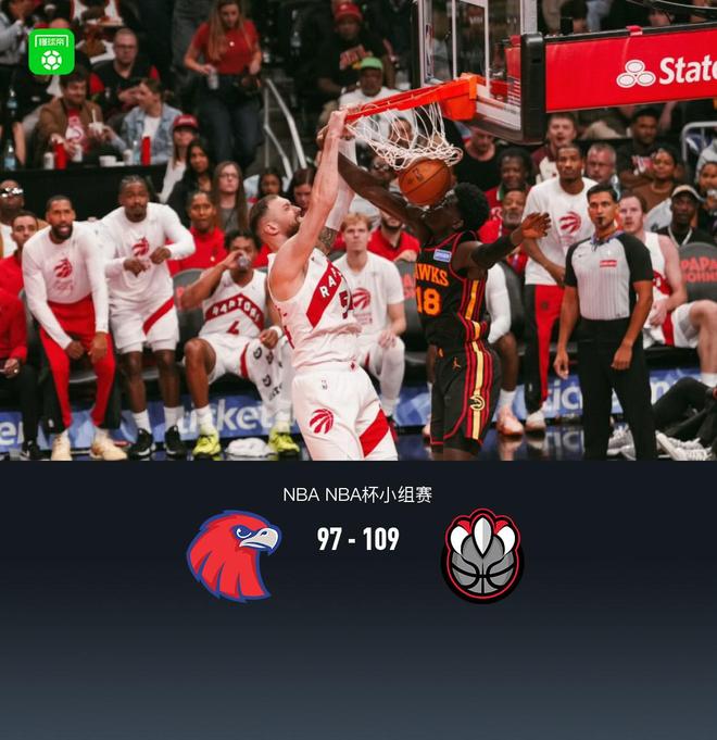 北京时间11月8日NBA NBA杯小组赛,亚特兰大老鹰对阵多伦多猛龙。半场老鹰53-44猛龙,第四节猛龙打出36-20的单节得分直接打崩老鹰,最终老鹰97-109惨遭猛龙逆转。