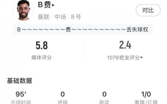 B费全场数据:失点+78.3%传球成功率,5.8分评分全场最低
