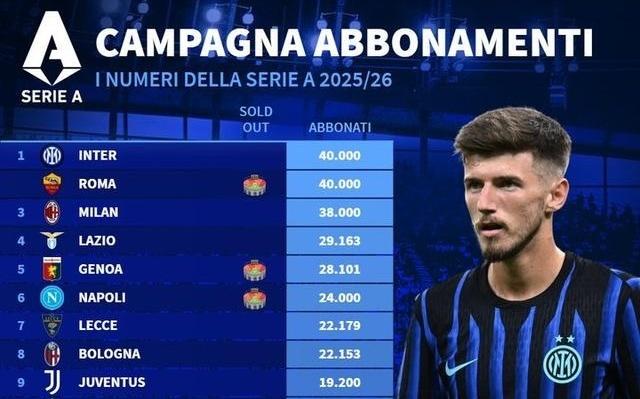 202526意甲俱乐部季票销售排名:国米、罗马4万张并列第一