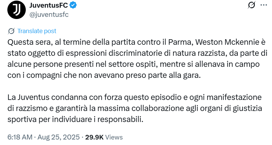尤文官方:球员麦肯尼遭帕尔马球迷种族歧视,将配合司法机构追查