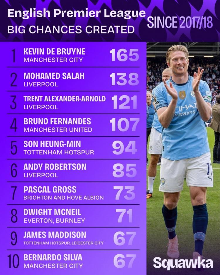 英超近9年创造重大机会榜:丁丁压萨拉赫居首阿诺德&B费均破百