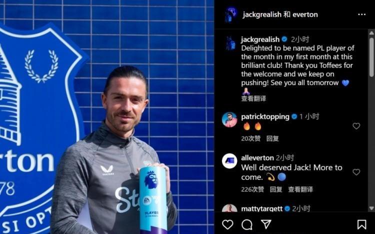 格拉利什晒奖杯:很高兴在加盟埃弗顿的首月就当选英超月最佳球员