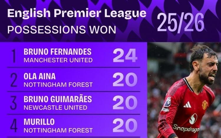 新赛季英超赢得球权榜:B费24次居首布鲁诺&帕奎塔&格拉利什在列