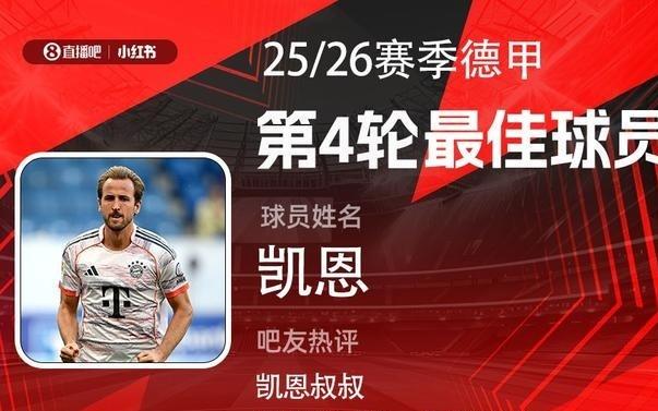 直播吧X小红书德甲第4轮最佳:凯恩再度当选!戴帽连场造3球