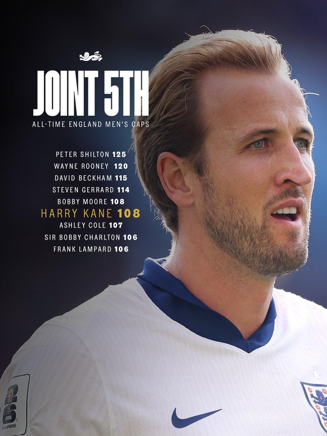 英格兰官方晒凯恩出场108次海报:与博比穆尔并列历史第5高