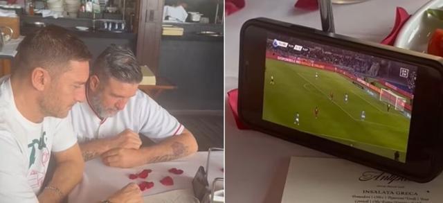 托蒂和坎德拉正在迈阿密参加EA7世界传奇人物Padel网球巡回赛的决赛。坎德拉在社交媒体发布动态,视频中他们两人在迈阿密的一家餐厅用手机观看罗马对阵那不勒斯的比赛直播。