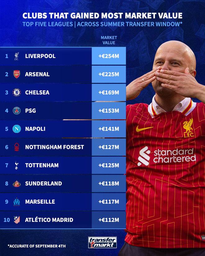 德转统计出夏窗后五大联赛球队身价涨幅榜TOP10,利物浦上涨2.54亿欧居首,阿森纳上涨2.25亿欧排第二,切尔西上涨1.69亿欧排第三,前十排名中英超占6席。