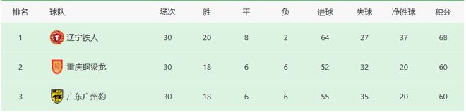 辽宁以68分成功拿到中甲冠军,晋级到中超;重庆和广州都是60分,前者以更少丢球成功携手辽宁实现晋级。