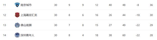 最后让我们再来看一下本赛季中甲最终的积分榜情况。